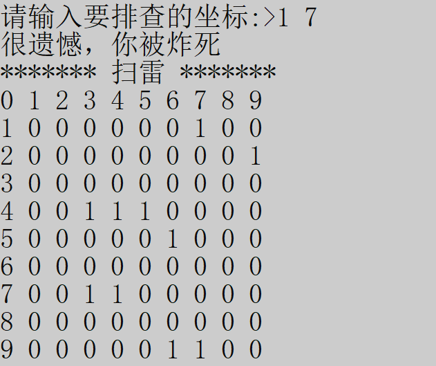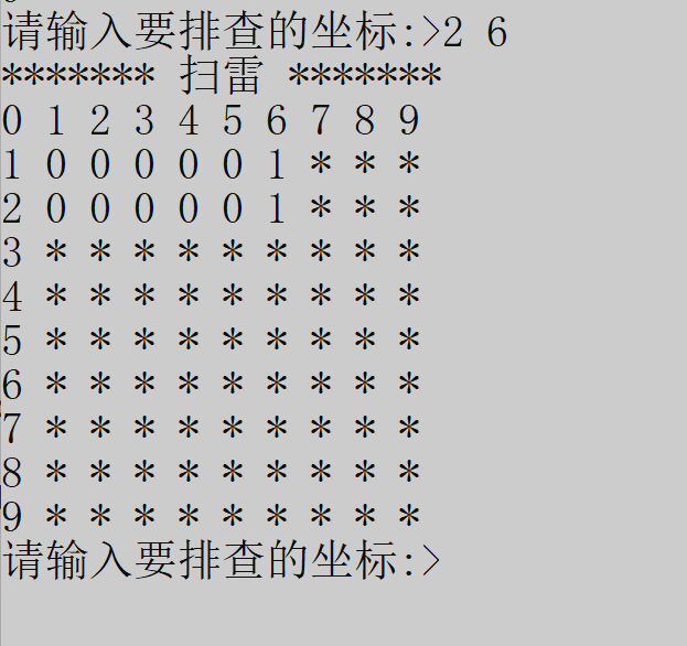 再继续分析,我们在棋盘上布置了雷,棋盘上有雷的信息(1)和非雷的信息(0),假设我们排查了某一个位置之后,这个坐标处并不是雷,但坐标的周围有1个雷,那我们就需要将排查出的雷的数量信息记录储存,并打印出来,作为排雷的重要参考信息。那么雷的个数信息又应该存放在何处呢?如果我们将其存放在布置雷的数组中,雷的信息和雷的个数信息就可能缠上混淆和打印上的困难。
