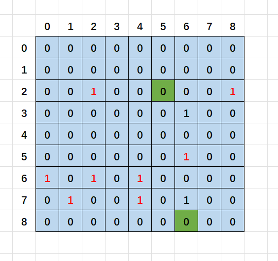 如果一个位置布置雷,那么我们就在这个位置存放1,没有雷就存放0。如下图: