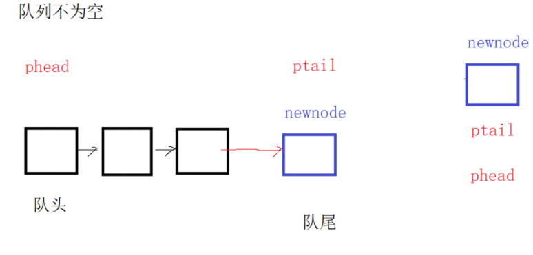 newnode->next = NULL; 3.处理空队列情况:如果队列为空(头指针为 NULL),将头指针和尾指针都指向新节点(新节点既是队头也是队尾)。