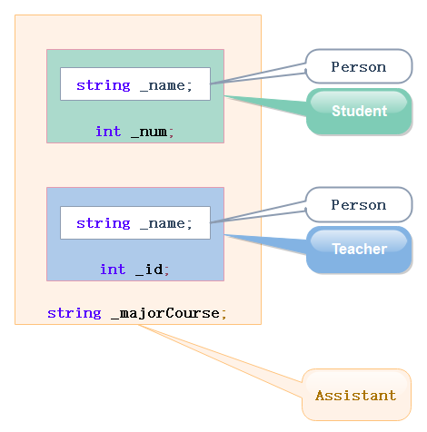 Assistant对象中有两个Person的_name成员)。a._name无法确定是Student继承的还是Teacher继承的)。class Person {