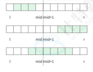 [l, mid] 内;[mid+1, r] 内;mid,左半部分的子段以 mid 结尾,右半部分的子段以 mid+1 开头。