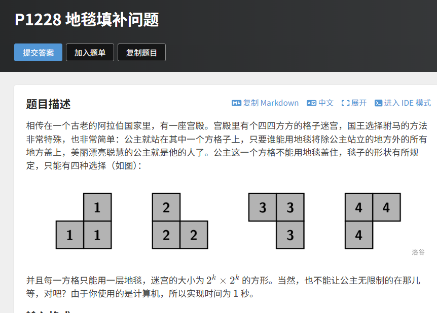 有一个 2^k × 2^k 的方形迷宫,其中有一个方格是公主的位置(不能用地毯覆盖)。我们需要用地毯将迷宫中除公主位置外的所有方格覆盖,地毯有四种形状(如下图所示),每种形状占 3 个方格,且只能覆盖相邻的方格(不能重叠、不能超出迷宫)。