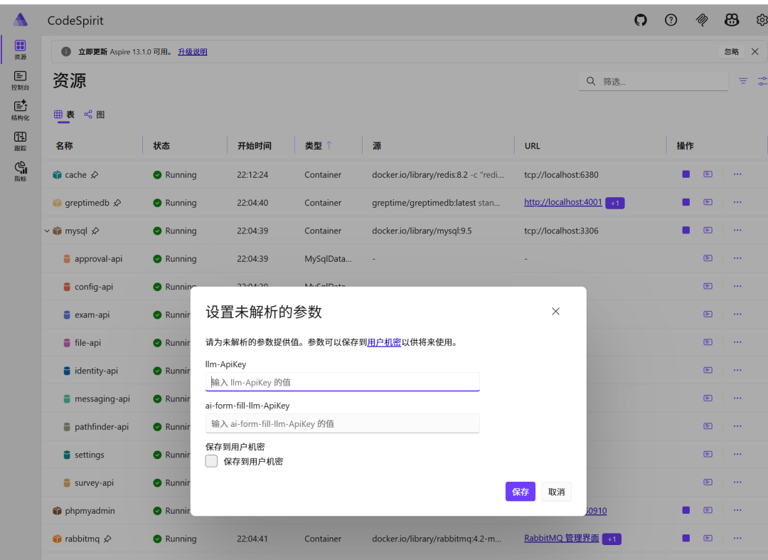 CodeSpirit 使用 .NET Aspire 的参数管理机制来配置敏感信息和环境相关参数。在首次启动前,您需要配置以下必填参数。提示UI如下: