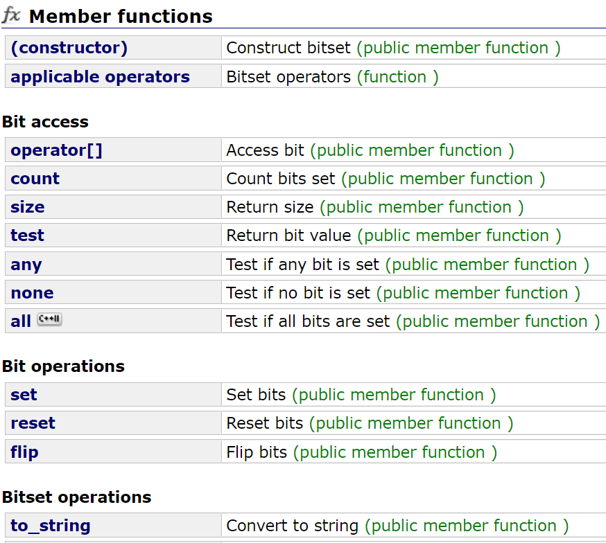 其技术文档链接如下:https://legacy.cplusplus.com/reference/bitset/bitset/