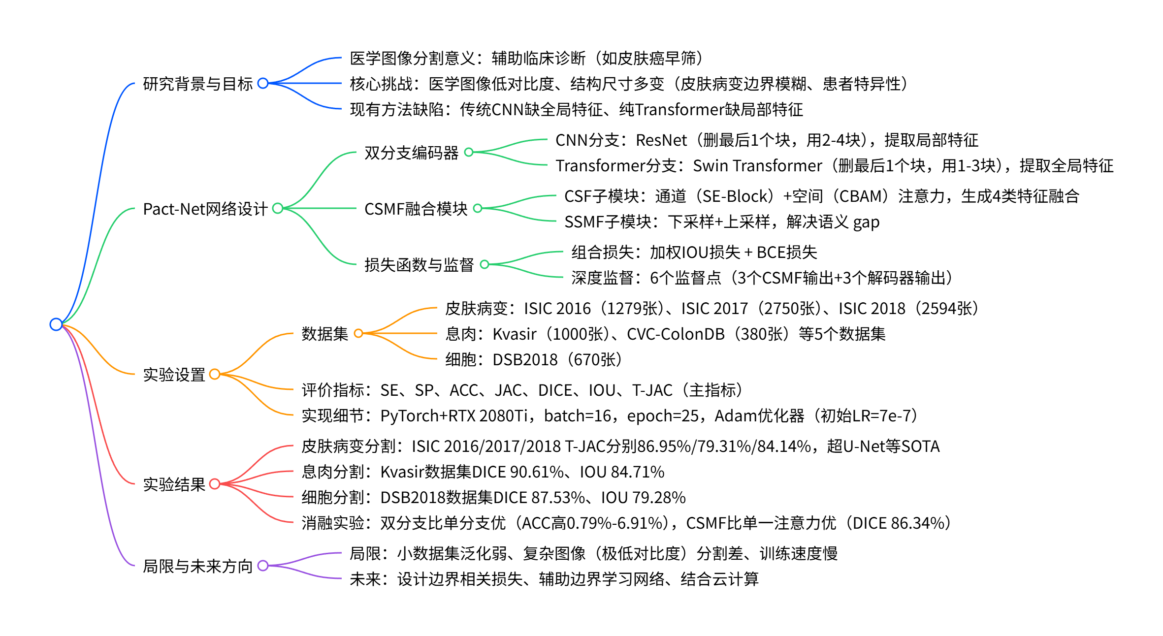 最近在顶刊《Computer Methods and Programs in Biomedicine》(2023 年 IF=7.0+)上看到一篇论文 ——《Pact-Net:Parallel CNNs and Transformers for Medical Image Segmentation》,这篇文章提出的 Pact-Net 网络,完美解决了医学图像分割中 "局部细节看不清、全局范围抓不准" 的痛点,在皮肤病变、息肉、细胞分割任务中全面碾压传统 U-Net 和 Transfuse 等 SOTA 模型,尤其是在 ISIC 2016 皮肤病变数据集上,关键指标 T-JAC 直接冲到 86.95%,把第二名远远甩在身后。 今天就带大家从头到脚拆解这个模型,从研究背景、核心设计到实验结果,用最通俗的语言讲明白 Pact-Net 到底牛在哪。无论你是医学 AI 领域的研究者、刚入门的算法小白,还是对皮肤癌早筛技术感兴趣的开发者,这篇文章都能让你收获满满~下面就让我们正式开始吧!