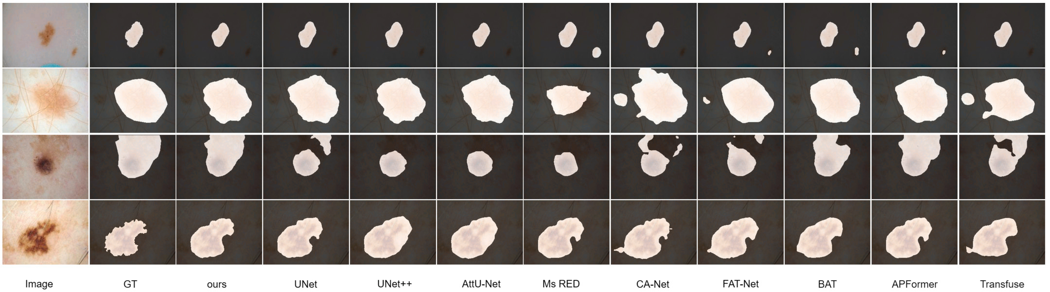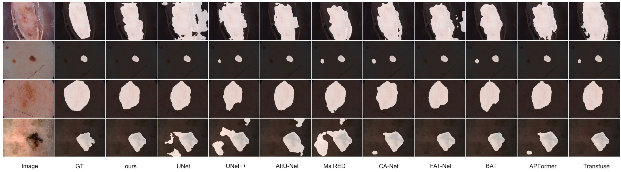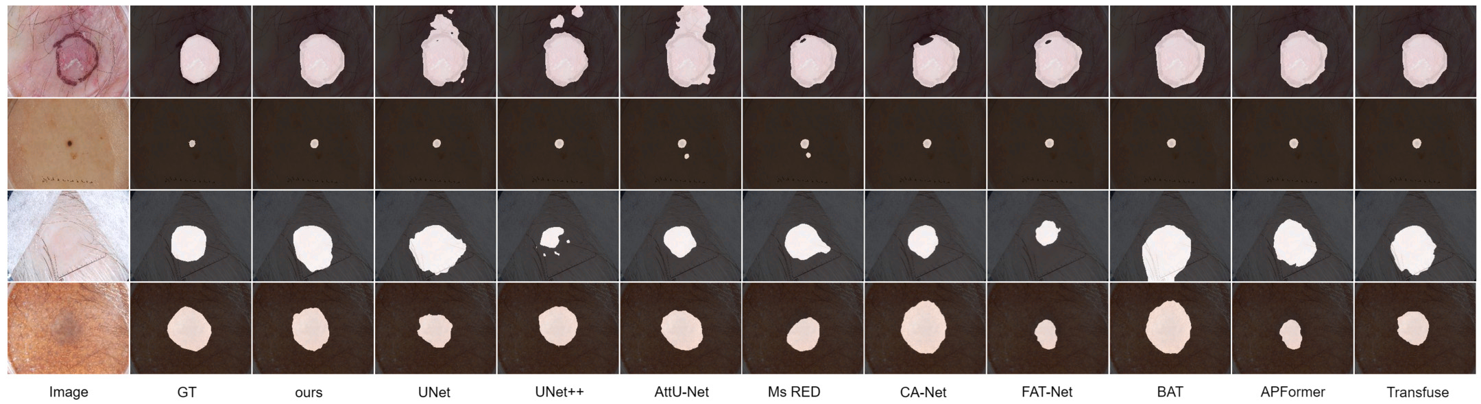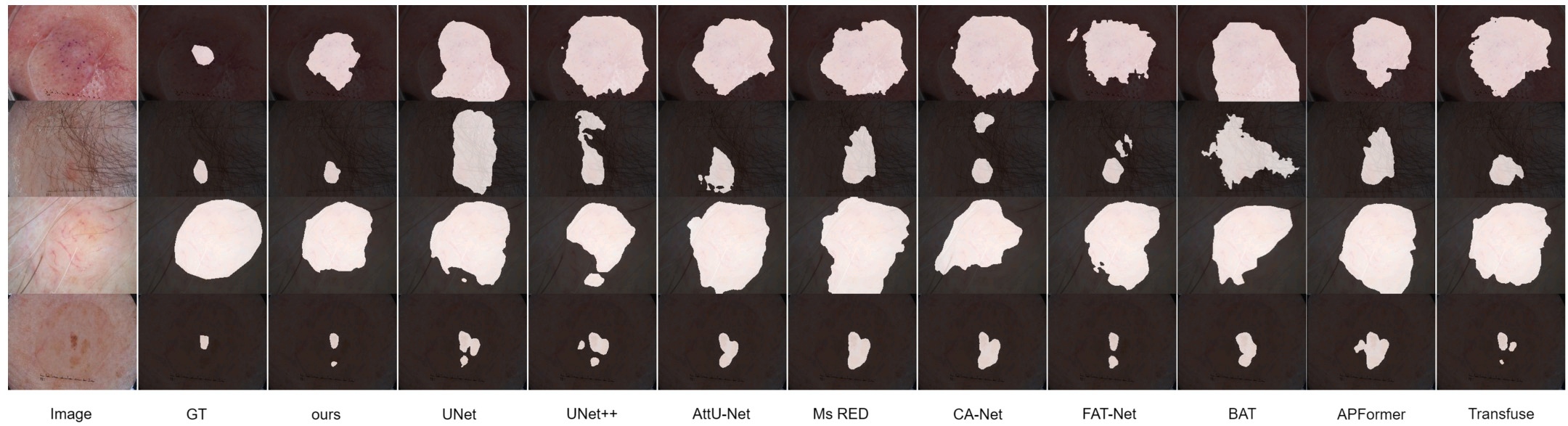 论文还做了可视化对比,从图中能明显看出:Pact-Net 分割出来的病变边界最接近 GT,尤其是在有毛发遮挡、低对比度的复杂场景下 —— 比如某张图像中病变被毛发挡住了一部分,U-Net 和 Transfuse 都漏判了被遮挡的区域,而 Pact-Net 通过融合局部细节(毛发间隙的病变纹理)和全局信息(病变整体形态),精准分割出了完整的病变区域。