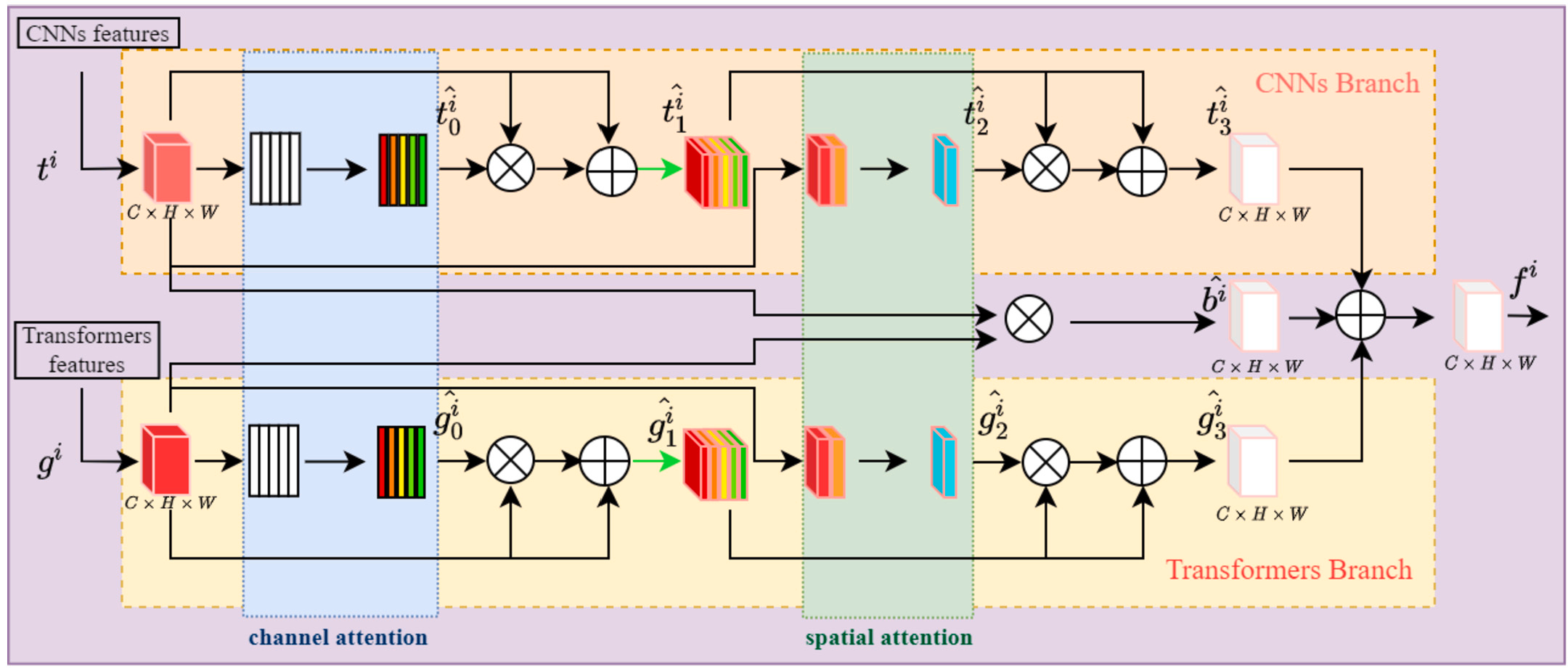 第二步:计算交互特征。把 CNN 的局部优化特征和 Transformer 的全局优化特征通过 3×3 卷积层相乘,得到一个 "交互特征"(记为 b^i)。这个特征的作用是捕捉两个分支的关联 —— 比如 "病变边缘"(局部)和 "病变整体位置"(全局)的对应关系,避免两个分支的特征 "各说各的"。
