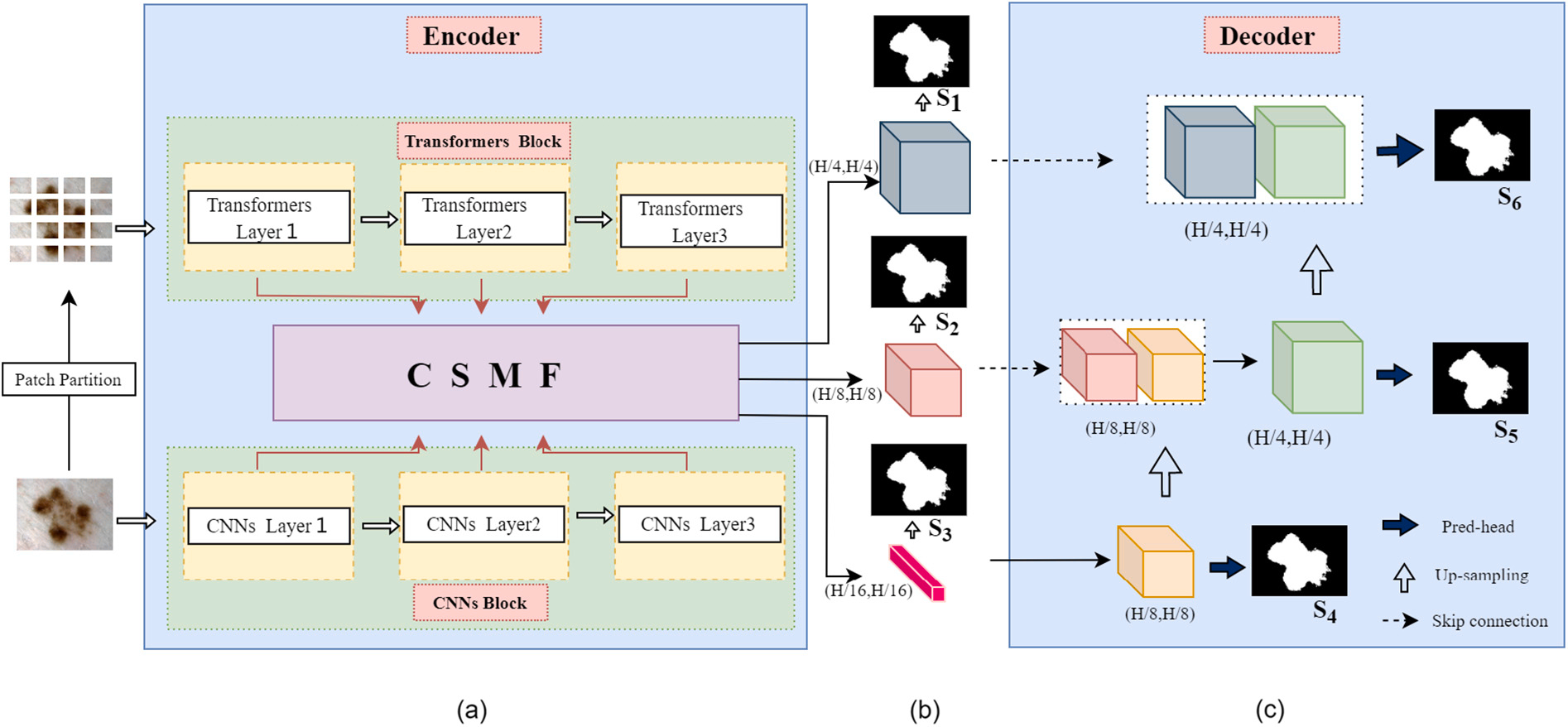 通过 CSF 的处理,CNN 和 Transformer 的特征终于 "说上话了",但还有一个问题:不同分辨率的特征之间存在 "语义 gap"(比如 1/16 分辨率的特征很抽象,1/4 分辨率的特征很具体),直接送给解码器会导致分割结果 "断层"。这时候就需要 SSMF 子模块出场了。