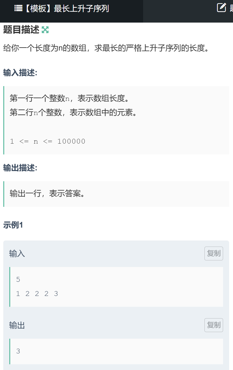 dp[1] = 1(序列 [1]);dp[2] = max(1, dp[1]+1) = 2(序列 [1,2]);dp[3] = max(1, dp[1]+1, dp[2]+1) = 3(序列 [1,2,4]);dp[4] = 1(序列 [1],前面的元素都比它大或相等);dp[5] = max(1, dp[1]+1, dp[4]+1) = 3(序列 [1,1,3] 或 [1,3]);dp[6] = max(1, dp[1]+1, dp[2]+1, dp[4]+1, dp[5]+1) = 4(序列 [1,2,3,4]);题目链接:https://ac.nowcoder.com/acm/problem/226831