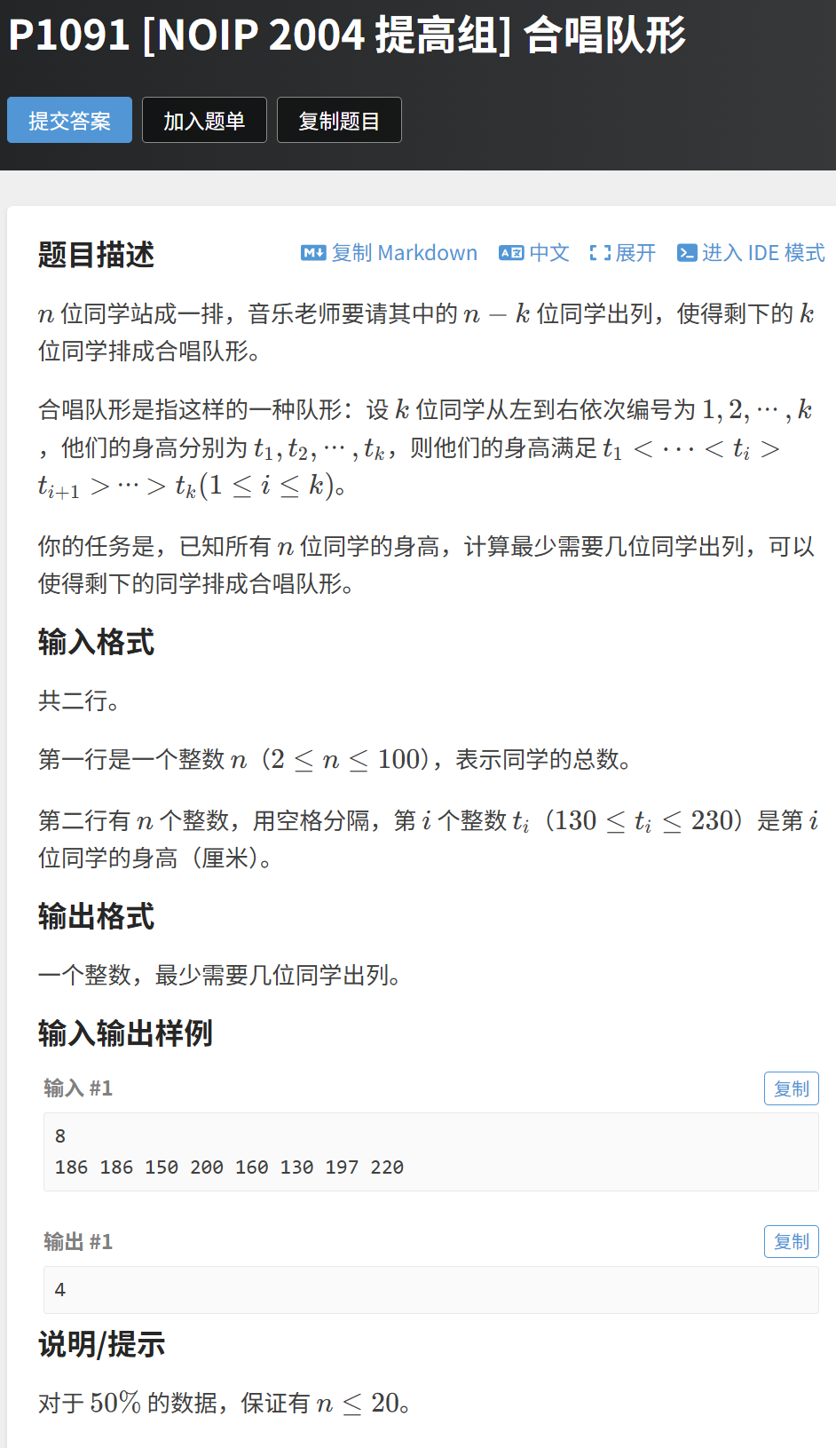 f数组的长度为 LIS 的长度,通常远小于 n。题目链接:https://www.luogu.com.cn/problem/P1091