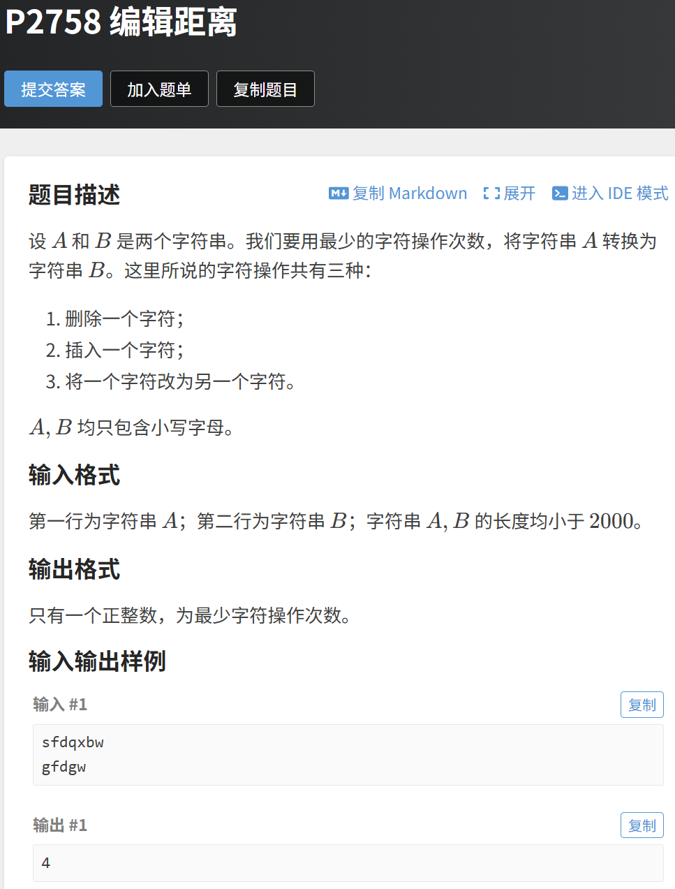 编辑距离是 LCS 的经典衍生题,其核心思想是:LCS 的长度越长,需要的编辑操作越少。