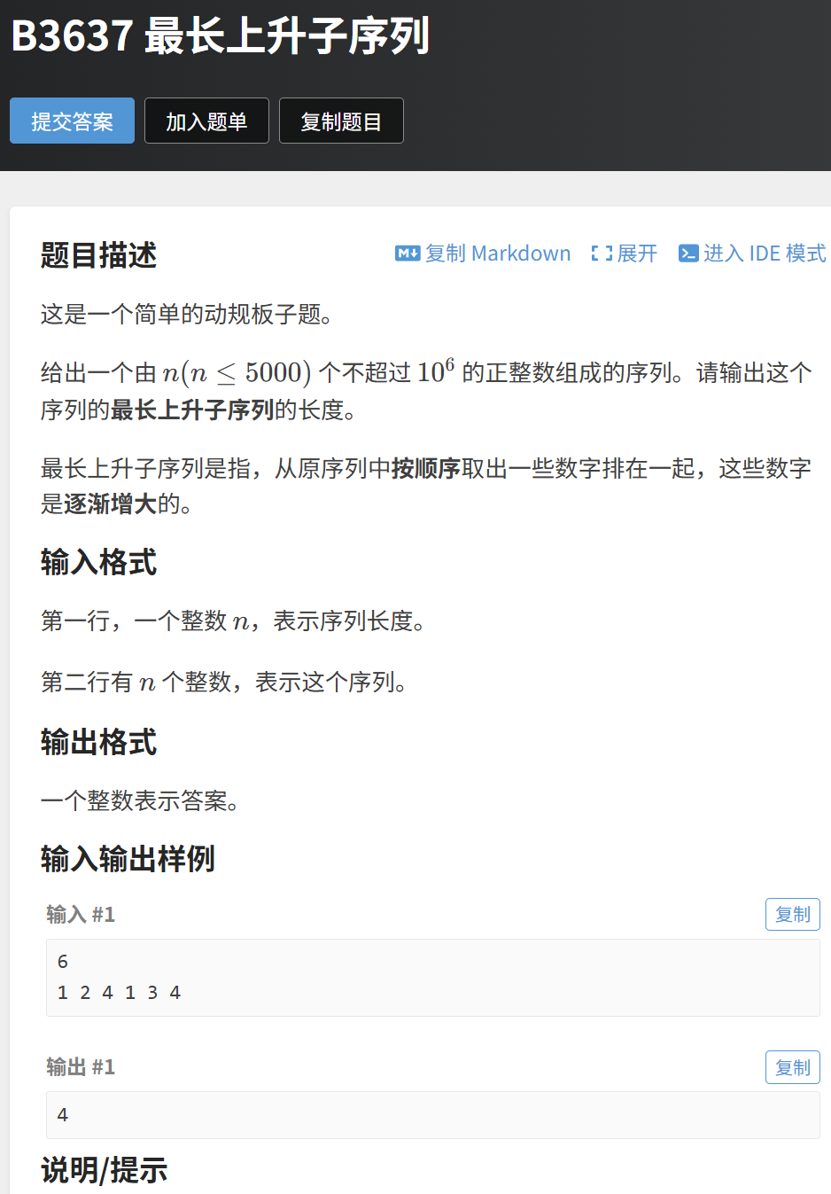 例如序列[1,2,4,1,3,4]的 LIS 是[1,2,3,4],长度为 4。