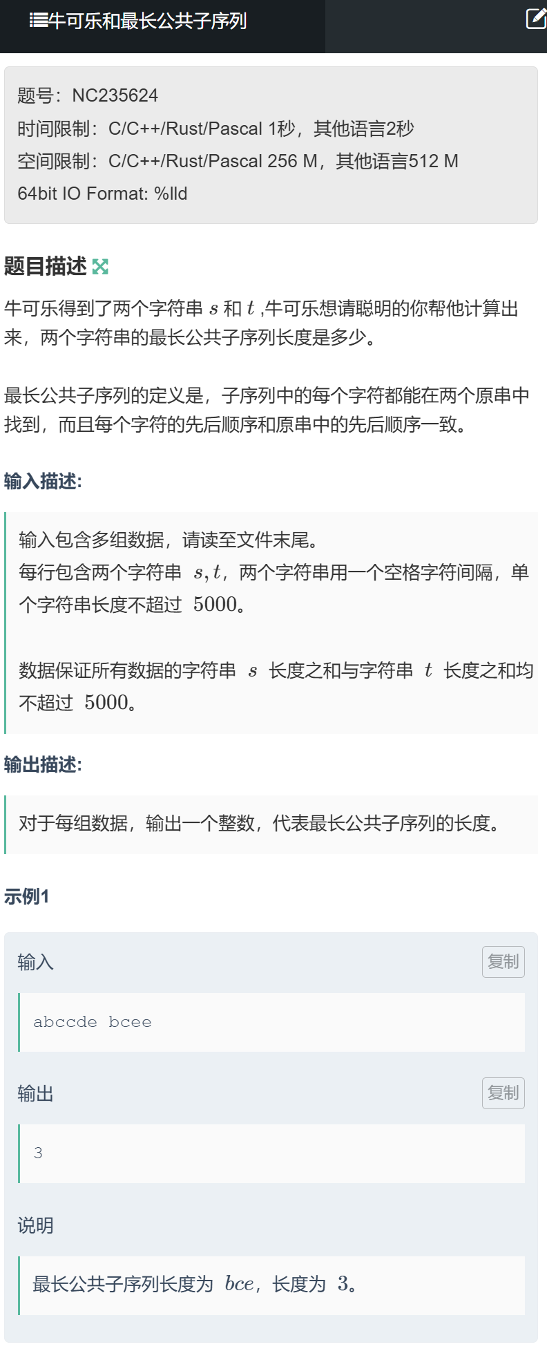 例如字符串s=abccde和t=bcee的 LCS 是bce,长度为 3。