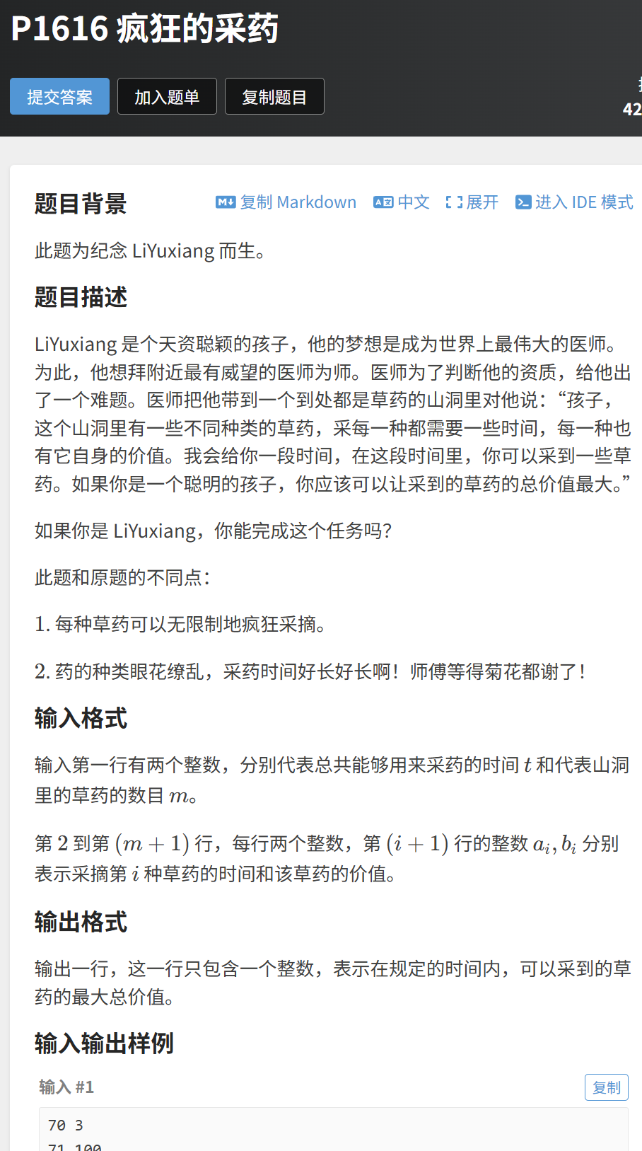 题目链接:https://www.luogu.com.cn/problem/P1616