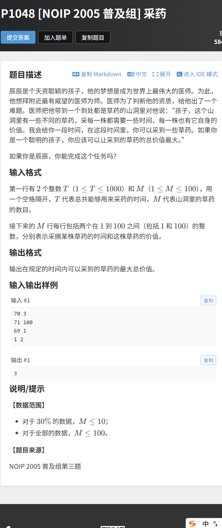 题目链接:https://www.luogu.com.cn/problem/P1048