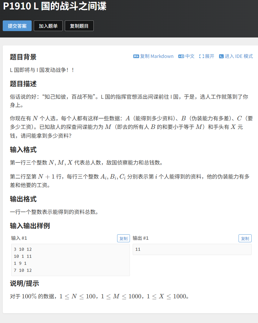 有N个人选,每个人有资料价值A[i]、伪装能力B[i](越小越差)、工资C[i]。敌国探查能力M(总伪装能力≤M),手头有X元(总工资≤X)。求能拿到的最大资料价值。