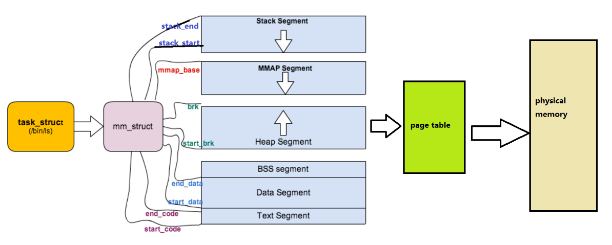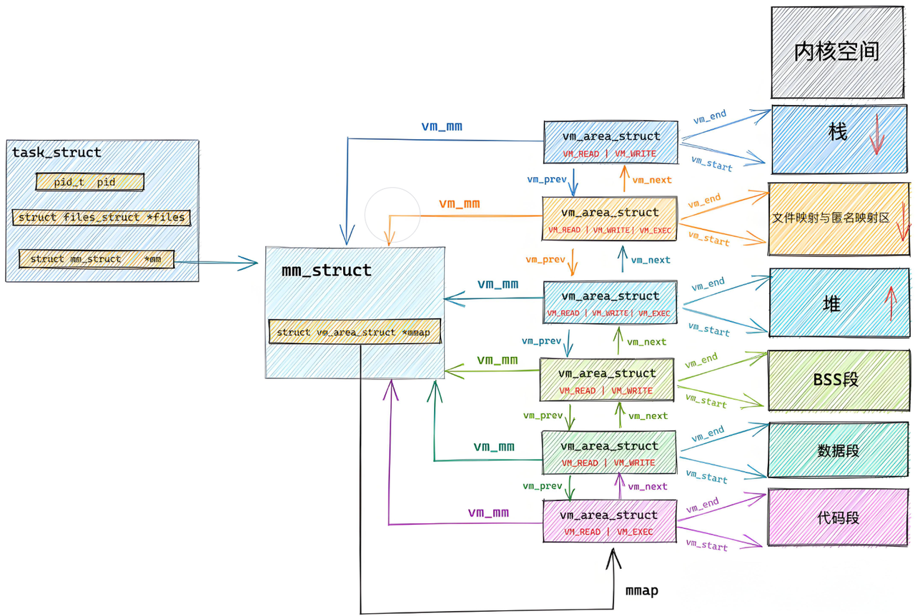 task_struct(PCB)是进程的 “身份证”,其中包含了指向mm_struct的指针,将进程的调度信息与内存信息关联起来: