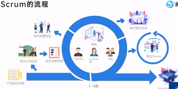 产品待办列表(Product Backlog)→ 迭代计划 → 每日站会(推进迭代)→ 演示会议(展示成果)→ 回顾会议(总结改进)→ 下一个迭代。