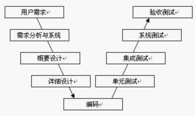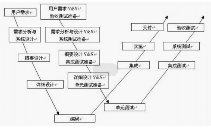 V 模型的左侧是 “开发阶段”,右侧是 “测试阶段”,一一对应: