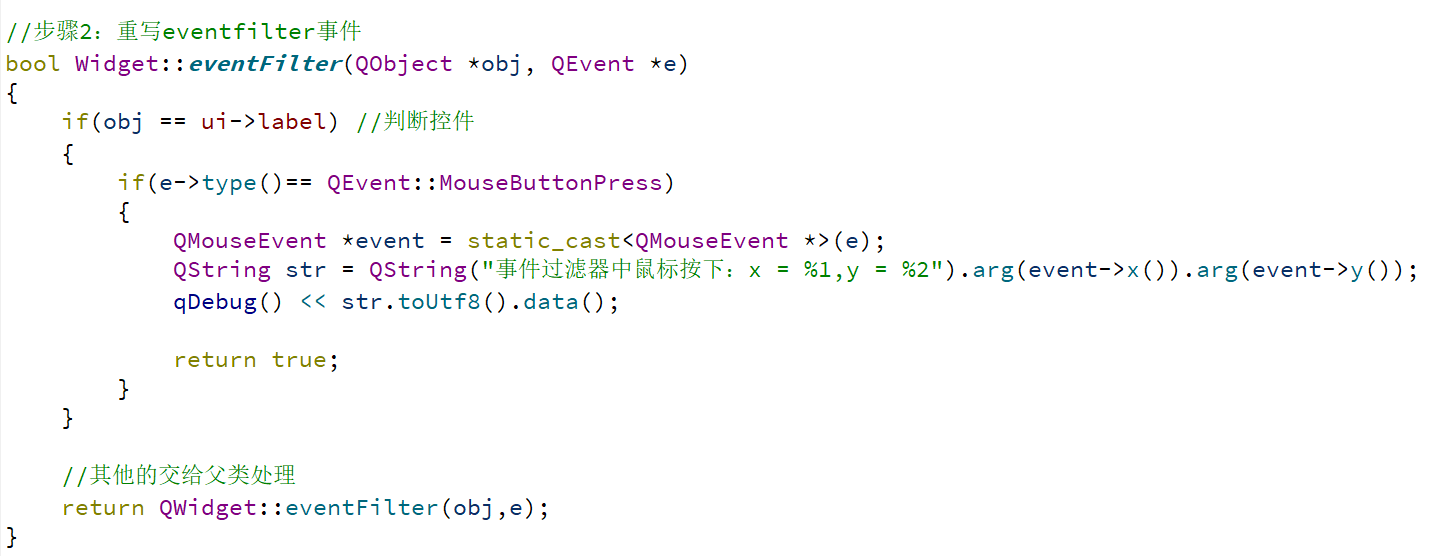 installEventFilter(QObject *filter));eventFilter(QObject *watched, QEvent *event)函数;eventFilter函数中判断事件类型和目标组件,处理事件后返回true(拦截事件)或false(继续传递事件);false,事件会继续传递给目标组件的event()函数和对应的事件处理函数。installEventFilter(QObject *filter):给当前组件安装事件过滤器,filter为过滤器对象;removeEventFilter(QObject *filter):移除事件过滤器;eventFilter(QObject *watched, QEvent *event):过滤器的核心函数,watched为目标组件(产生事件的组件),event为事件对象,返回true表示拦截事件。特性 | 事件过滤器 | 事件分发器 |