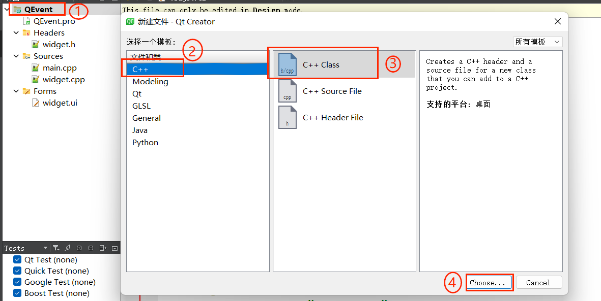 先选中项目名称 QEvent,点击鼠标右键,选择 add new ... ,弹出如下对话框: