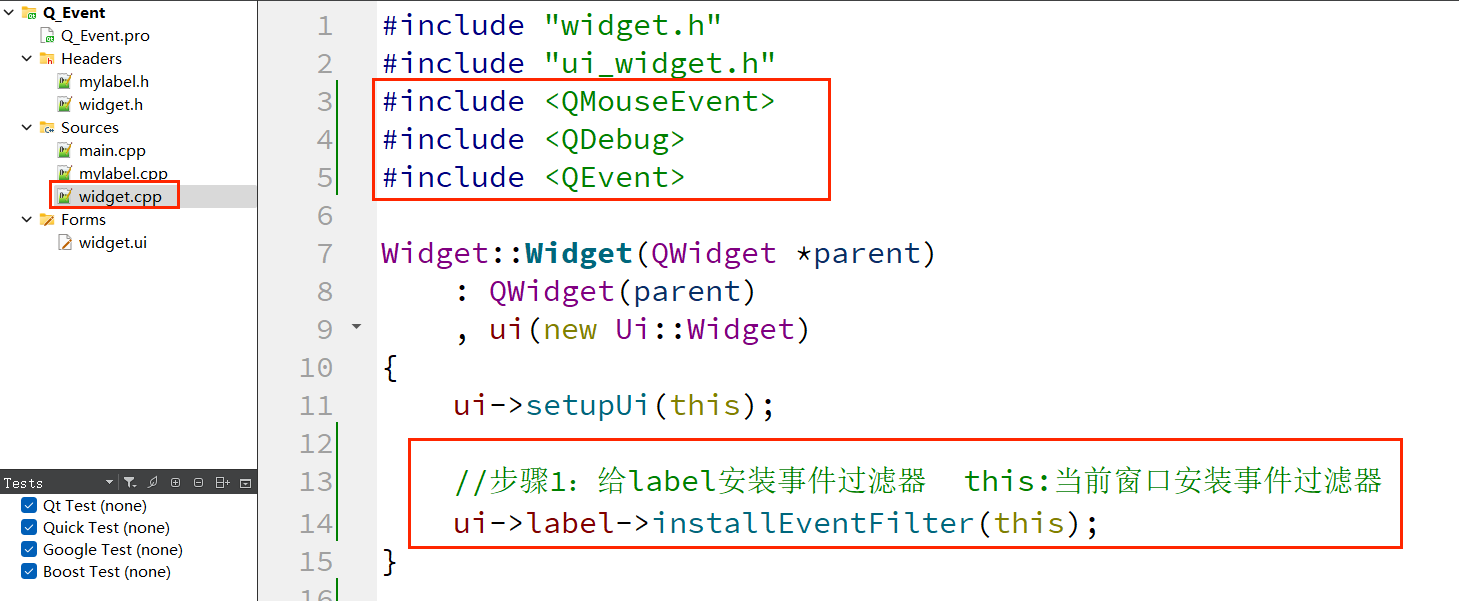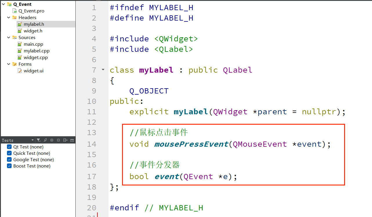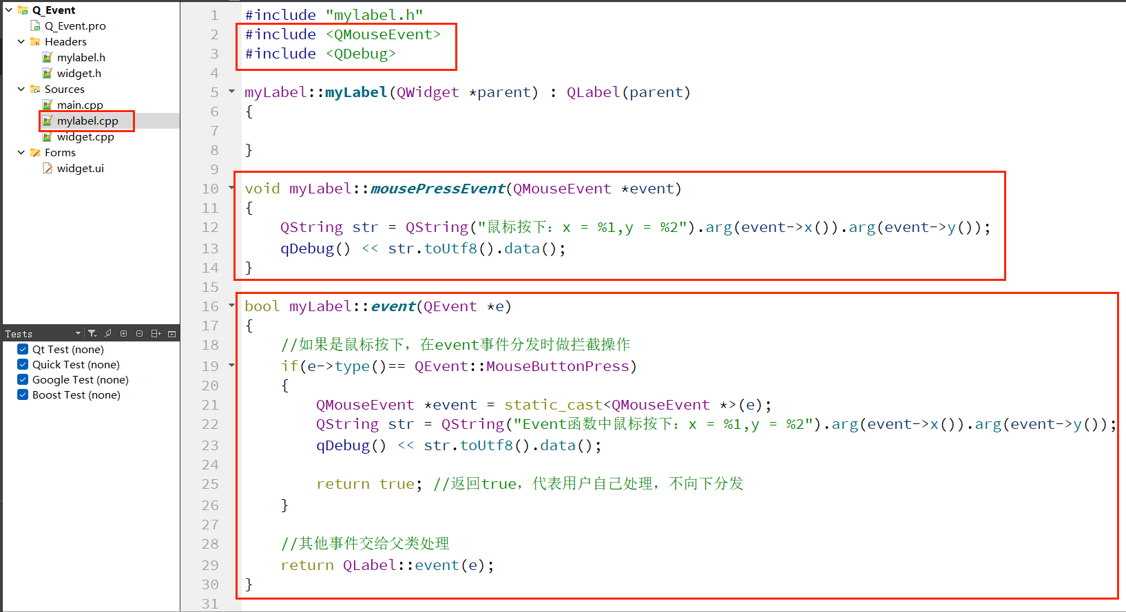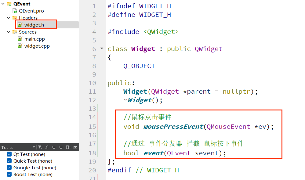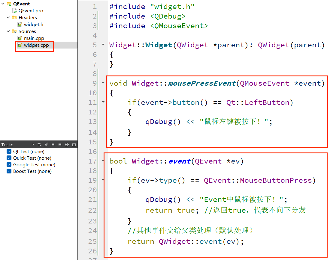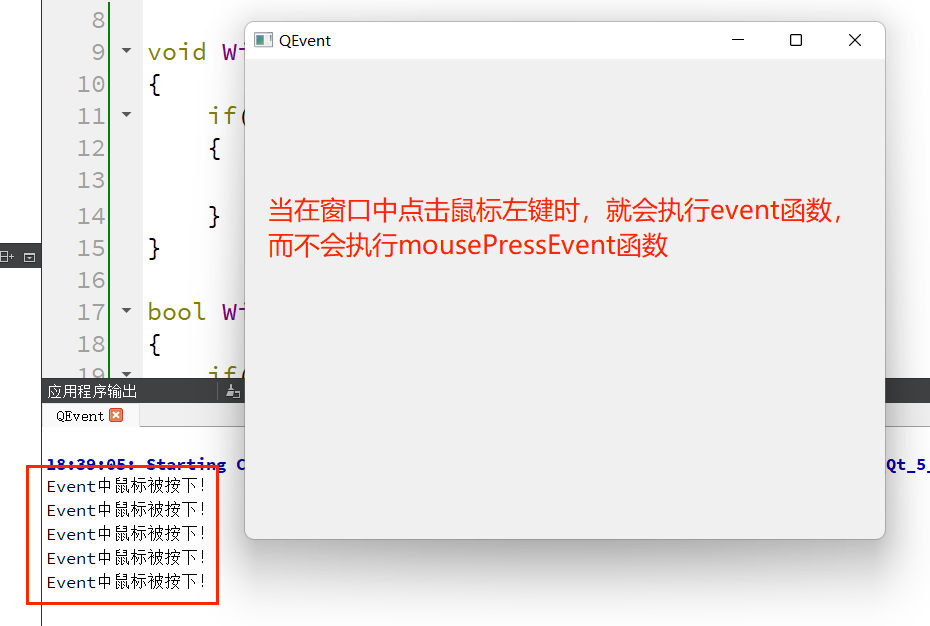下面通过重写event()函数,实现 “拦截鼠标按下事件,使其不触发mousePressEvent” 的功能,验证事件分发器的优先级。
