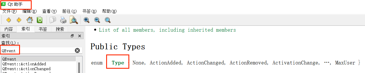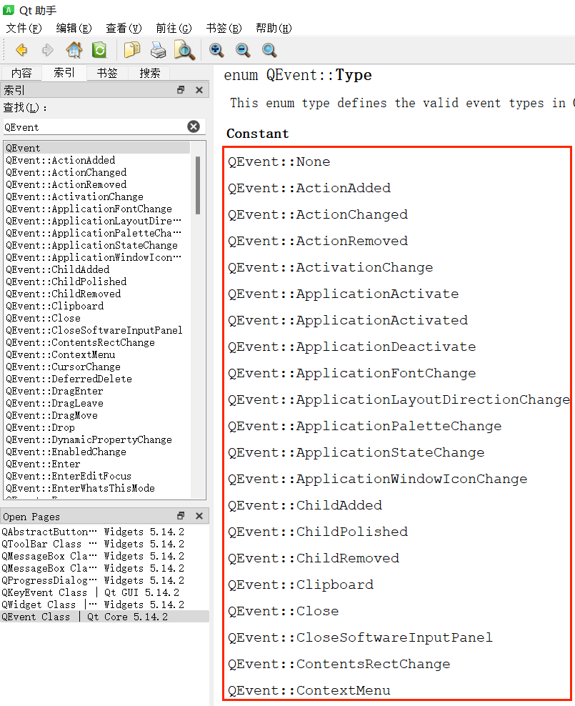 QEvent::MouseButtonPress(鼠标按下)、QEvent::MouseButtonRelease(鼠标释放)、QEvent::MouseMove(鼠标移动);QEvent::KeyPress(按键按下)、QEvent::KeyRelease(按键释放);QEvent::Timer(定时器触发);QEvent::Show(窗口显示)、QEvent::Resize(窗口大小改变)。 完整的事件类型可在 Qt 助手(Qt Assistant)中搜索QEvent查看。