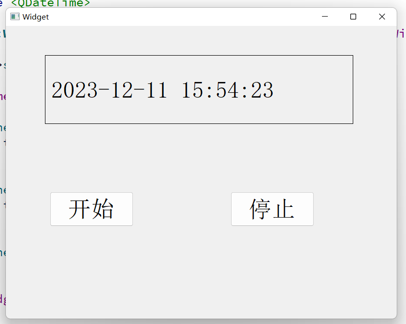 点击 “开始” 按钮,Label 实时显示当前系统时间,每秒刷新一次;点击 “停止” 按钮,时间停止更新。