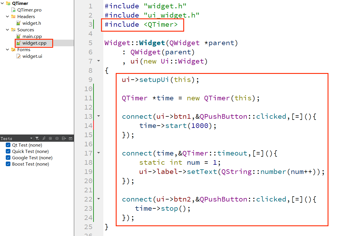 startTimer()启动定时器后,会返回唯一的定时器 ID,用于在timerEvent()中区分不同定时器;killTimer(timer_id),例如killTimer(timer_id1)会停止 1 秒间隔的定时器;static变量用于保持计数状态,每次定时器触发时自增,避免变量被重新初始化。 QTimer是 Qt 推荐的定时器使用方式,支持信号槽机制,可灵活实现启动、暂停、单次触发等功能。下面实现 “点击开始按钮开始计数,点击停止按钮暂停计数” 的功能。