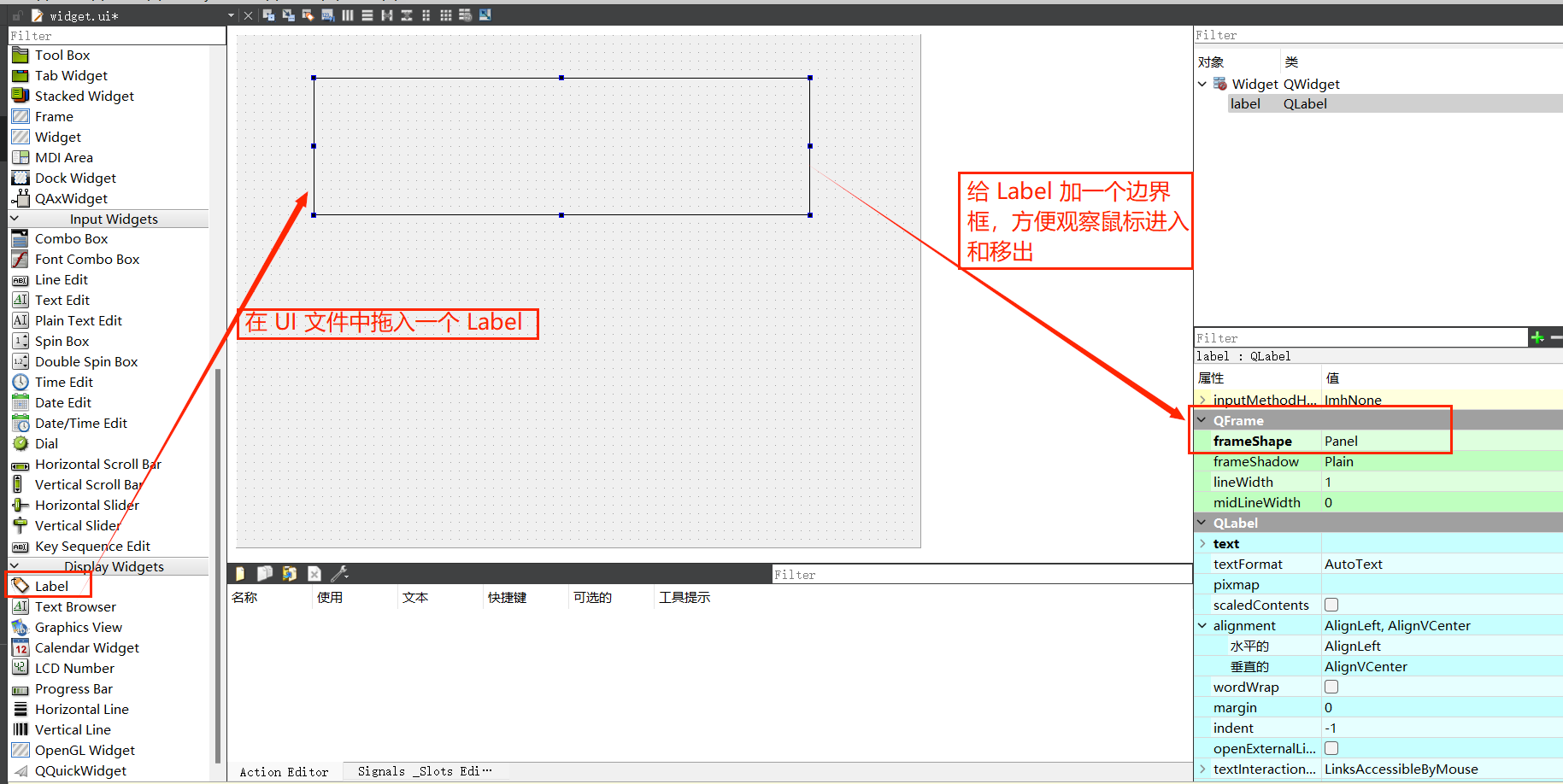 打开widget.ui,拖入一个Label,并给Label添加边界框,便于观察。