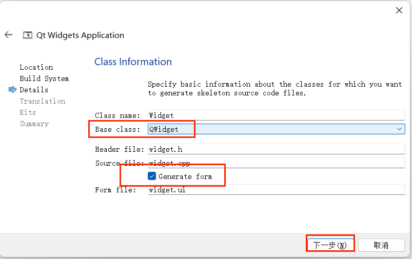 新建 Qt Widgets Application 项目,基类选择QWidget,勾选 “Generate form”(生成 UI 文件)。
