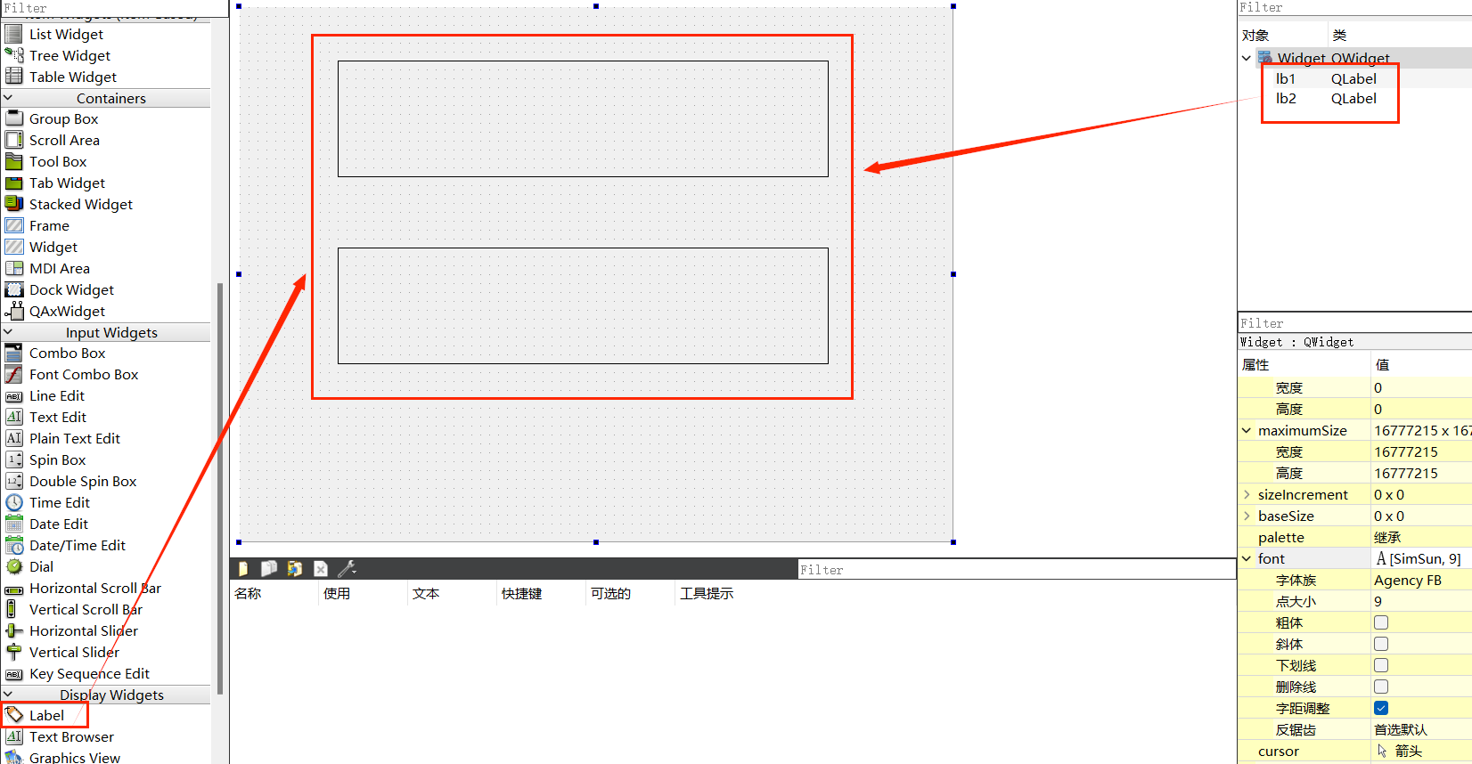 打开widget.ui,拖入两个QLabel控件,分别命名为lb1和lb2,用于显示计数结果(可设置字体大小和对齐方式,方便观察)。