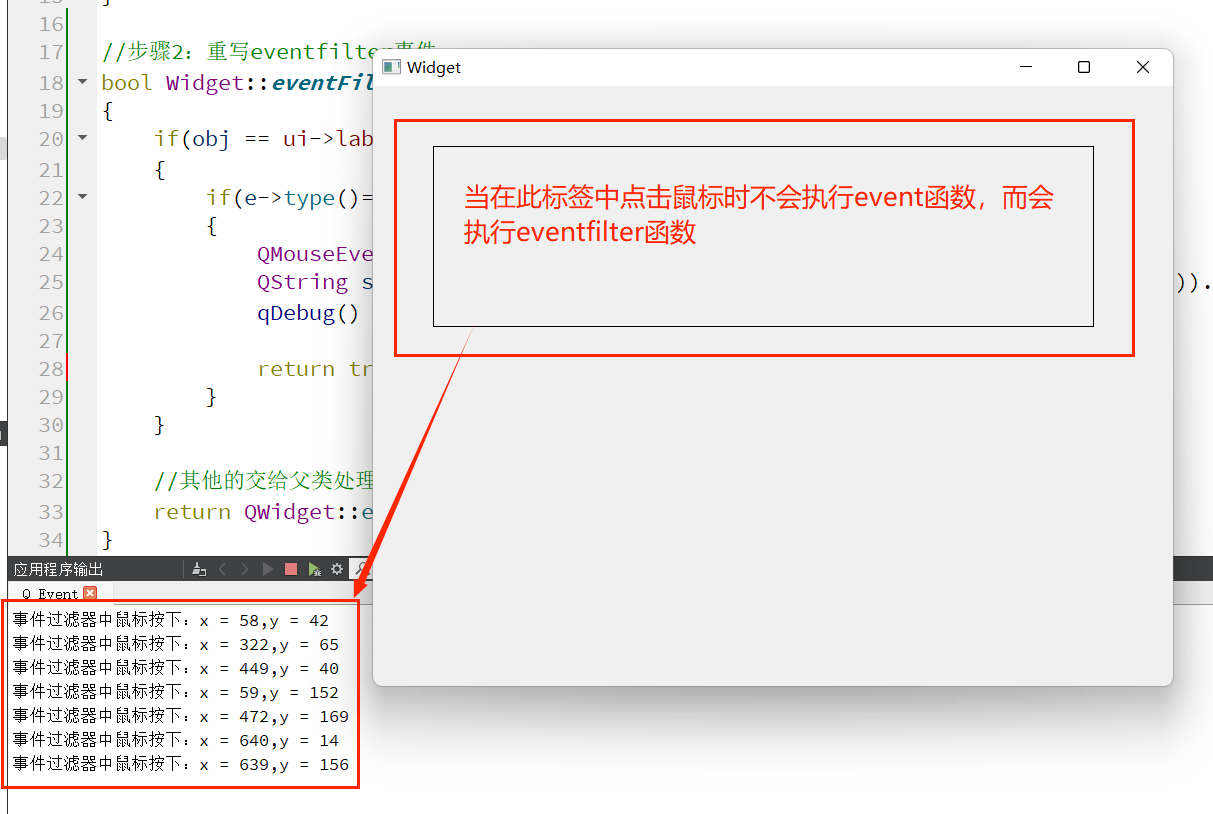 点击自定义标签后,控制台只输出 “事件过滤器中鼠标按下,x=xx, y=xx ”,而MyLabel的mousePressEvent函数不会被触发,说明事件被成功拦截。