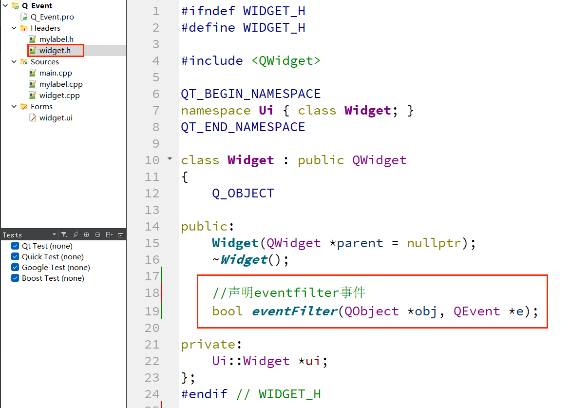 QEvent对象;event()函数接收事件,根据事件类型(event->type())分发到对应的事件处理函数;true表示事件已处理,不再传递;若返回false,事件会继续向上传递给父组件。 event()函数是QObject类的虚函数,定义如下: