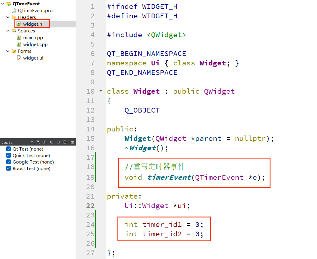 QTimerEvent相关: startTimer(int interval):启动定时器,返回定时器 ID,interval为时间间隔(毫秒);killTimer(int timerId):停止指定 ID 的定时器;timerEvent(QTimerEvent *e):定时器事件处理函数,通过e->timerId()获取触发的定时器 ID。QTimer相关: start(int interval):启动定时器,interval为时间间隔(毫秒);stop():停止定时器;setSingleShot(bool singleShot):设置为单次触发(true)或循环触发(false);timeout():定时器触发时发出的信号,需绑定槽函数处理任务。 QTimerEvent通过定时器 ID 区分多个定时器,适合需要同时运行多个独立定时任务的场景。下面实现 “两个 Label 分别每隔 1 秒和 2 秒累加计数” 的功能。