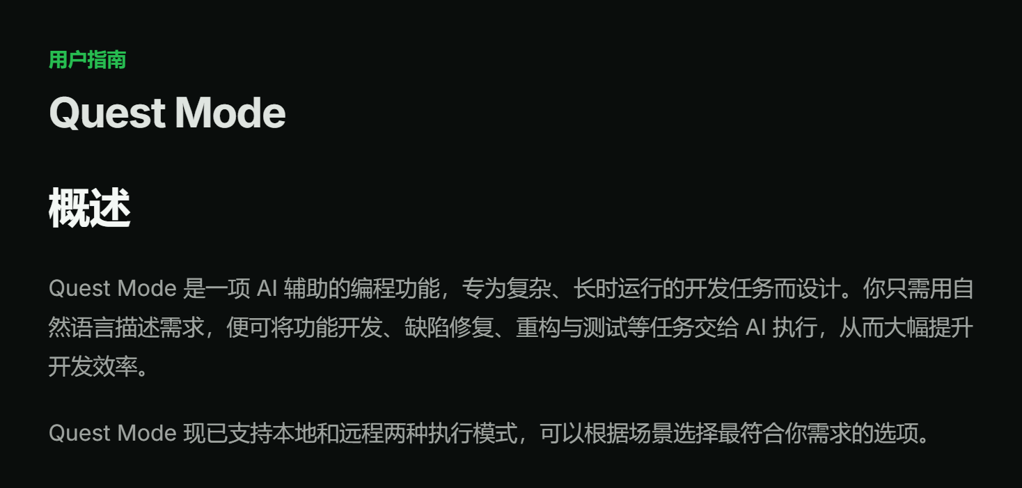 云端沙箱 | Quest 模式异步执行、大规模任务处理 | 复杂项目重构、批量开发 |