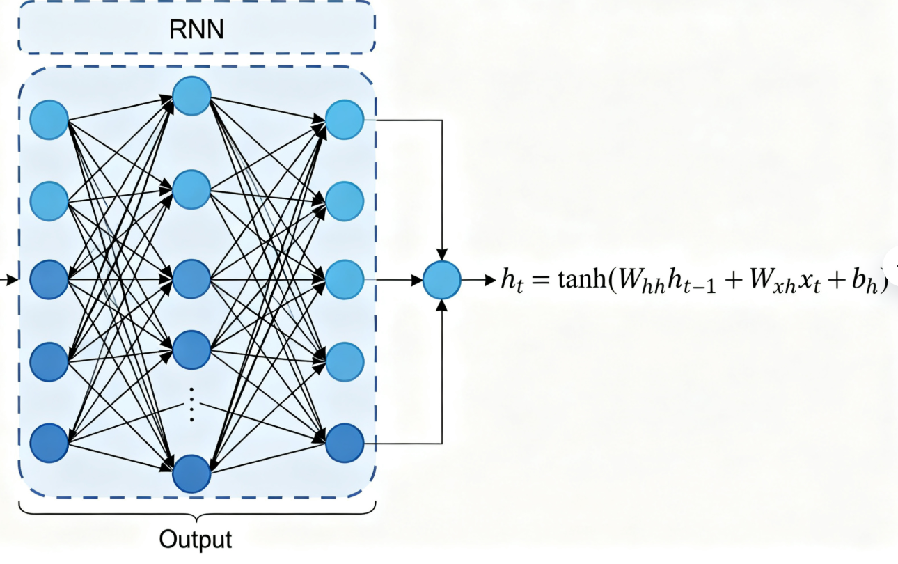 其中,\(x_t\)为\(t\)时刻的输入,\(h_t\)为\(t\)时刻的隐藏状态,\(y_t\)为\(t\)时刻的输出,\(W_{hh}\)、\(W_{xh}\)、\(W_{hy}\)为权重矩阵,\(b_h\)、\(b_y\)为偏置项,\(\tanh\)为激活函数,\(\sigma\)为 sigmoid 激活函数(用于分类任务)。