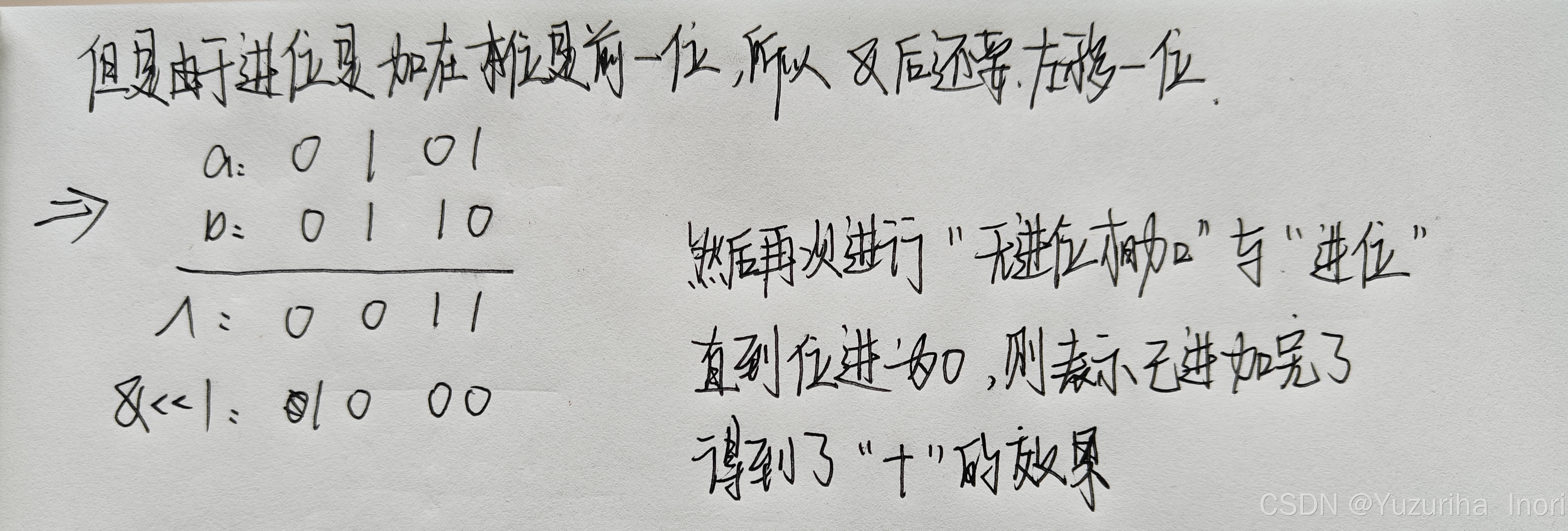 当与(进位)的结果为0时,代表不再进位了。此时异或(无进位相加)的结果就是最终的计算结果