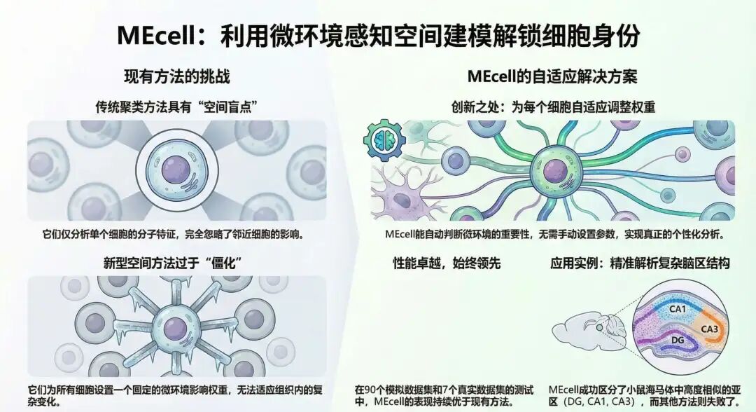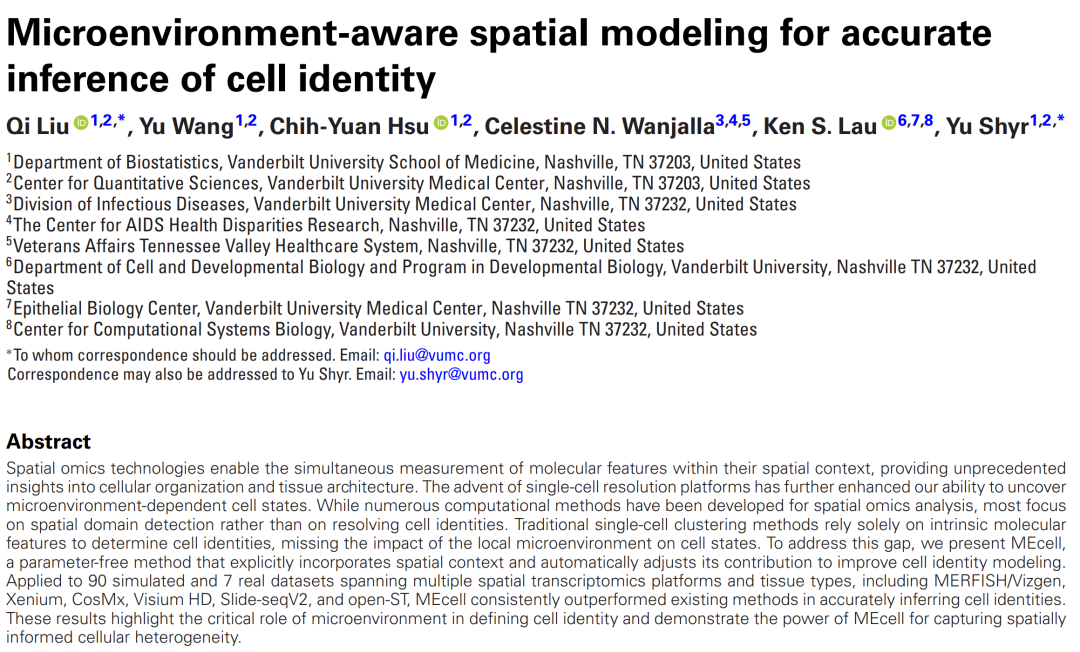 随着单细胞和空间组学技术的飞速发展,我们对组织架构的理解已进入了“高清时代”。然而,如何准确鉴定空间背景下的细胞身份(Cell Identity)依然是生信分析中的一大挑战。传统的单细胞聚类方法往往只关注细胞自身的分子特征,而忽略了局部微环境对细胞状态的影响。近日,来自范德堡大学(Vanderbilt University)的团队在《Nucleic Acids Research》上发表了题为 Microenvironment-aware spatial modeling for accurate inference of cell identity 的研究。该研究提出了一种名为 MEcell 的无参数、自适应方法,通过整合内在分子特征和组织微环境信息,显著提升了细胞身份鉴定的准确性。