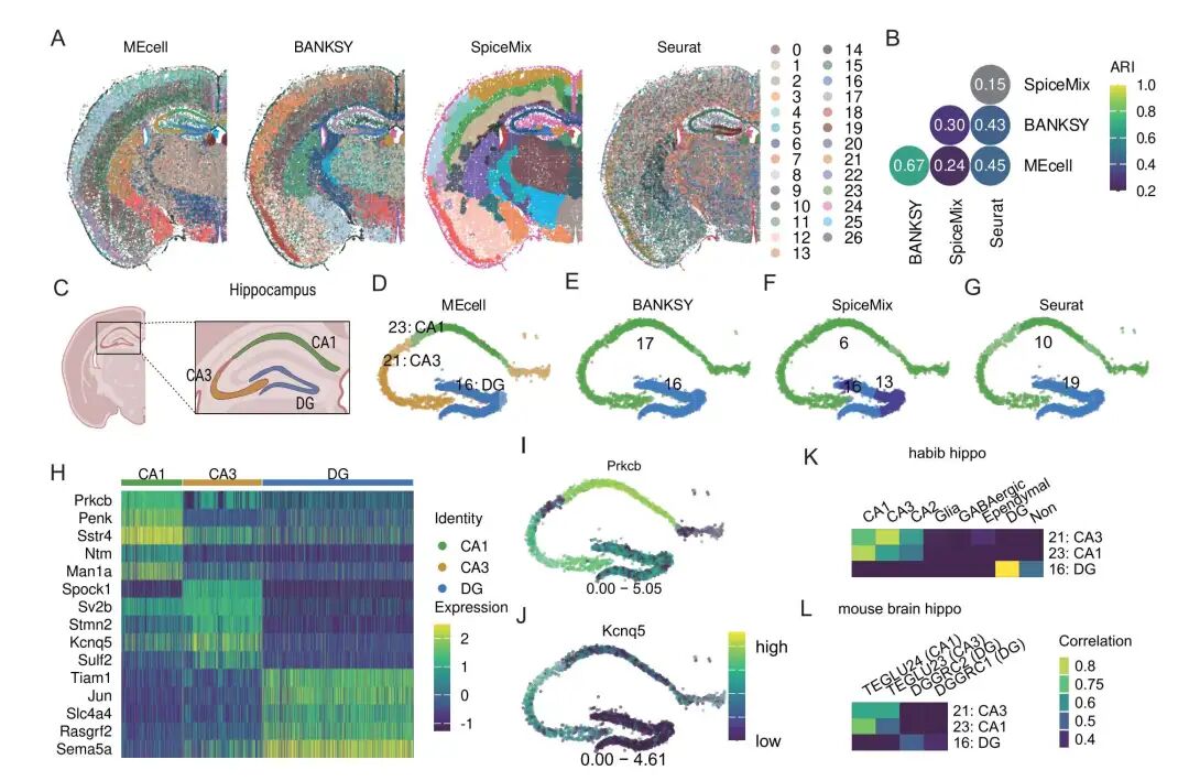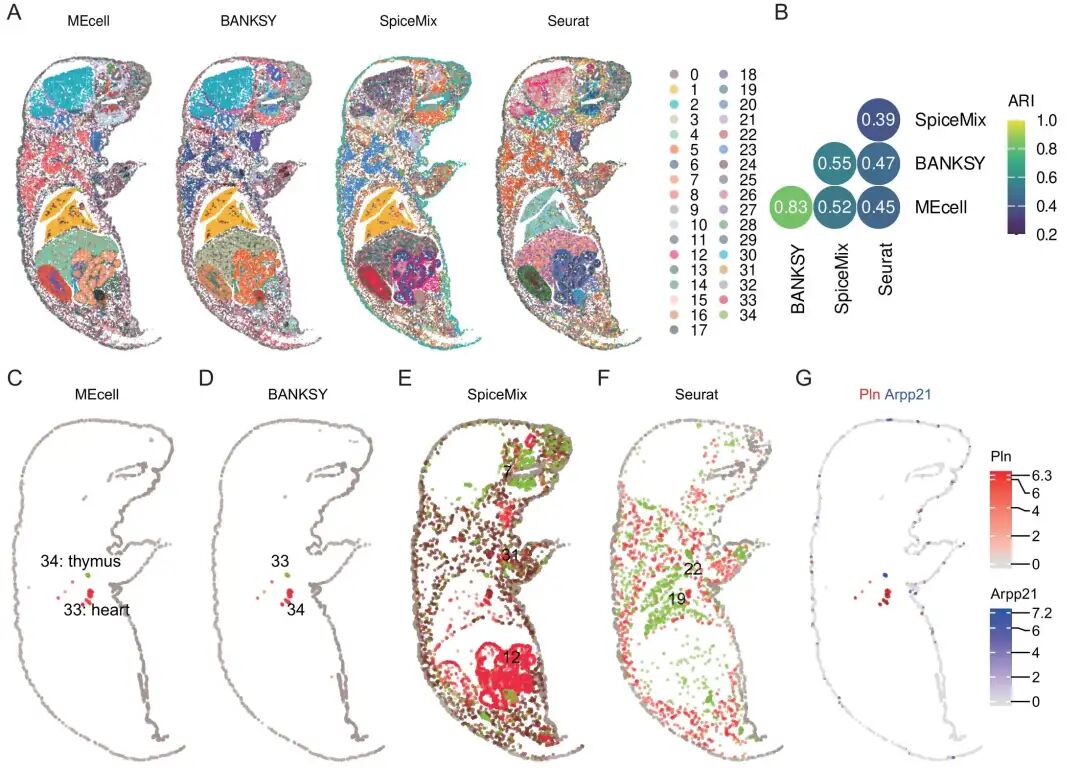 • 解决“过度平滑”问题:BANKSY 由于使用固定全局权重,在转录组截然不同但物理位置邻近的区域(如内耳和外耳)容易出现错误分类(将两类细胞聚在一起)。MEcell 则能通过识别强内在信号来避免过度依赖空间线索,从而在保持转录组忠实度的同时精准捕获组织异质性。