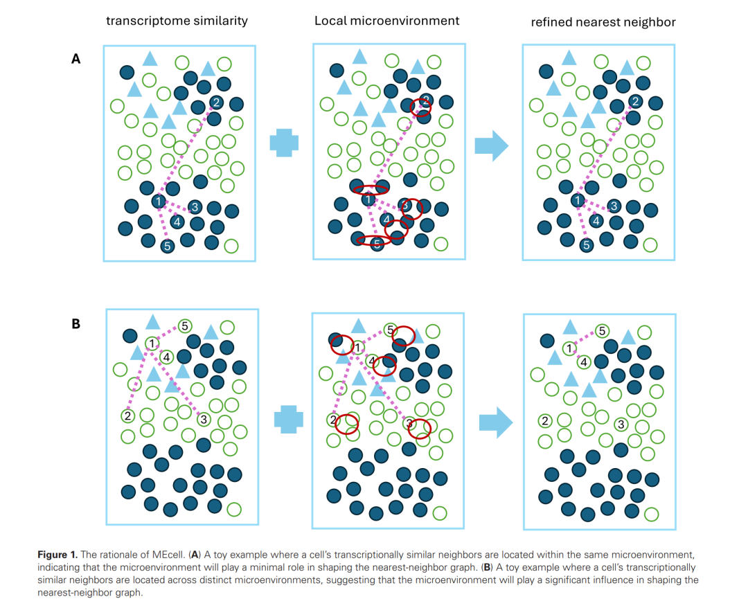 MEcell 的中心思想非常聪明: 如果一个细胞的分子特征邻居(基因表达相似的细胞)恰好也在相似的微环境中,那么空间信息提供的额外信息较少,权重降低;反之,如果基因表达相似的细胞分布在完全不同的微环境中,说明内在信号可能不足以区分其真实状态,此时空间信息将扮演更重要的角色;