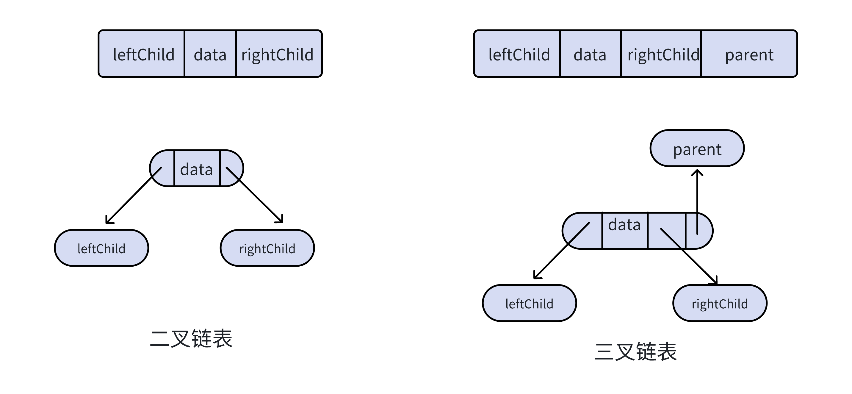 二叉树的链式存储结构是指,用链表来表示一棵二叉树,即用链来指示元素的逻辑关系。通常的方法是链表中每个结点由三个域组成,数据域和左右指针域,左右指针分别用来给出该结点左孩子和右孩子所在的链结点的存储地址。链式结构又分为二叉链和三叉链,当前我们学习中一般都是二叉链。后面博客讲解到高阶数据结构如红黑树等会用到三叉链。