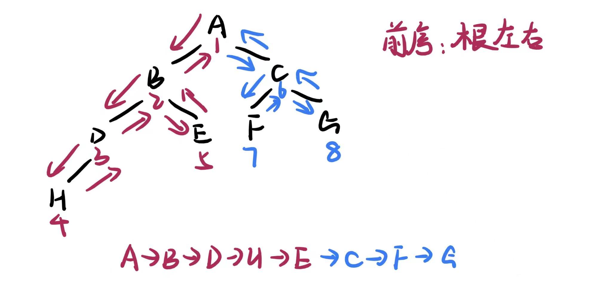 我们要记住三种遍历规则: 1)前序遍历:根左右 2)中序遍历:左根右 3)后序遍历:左右根