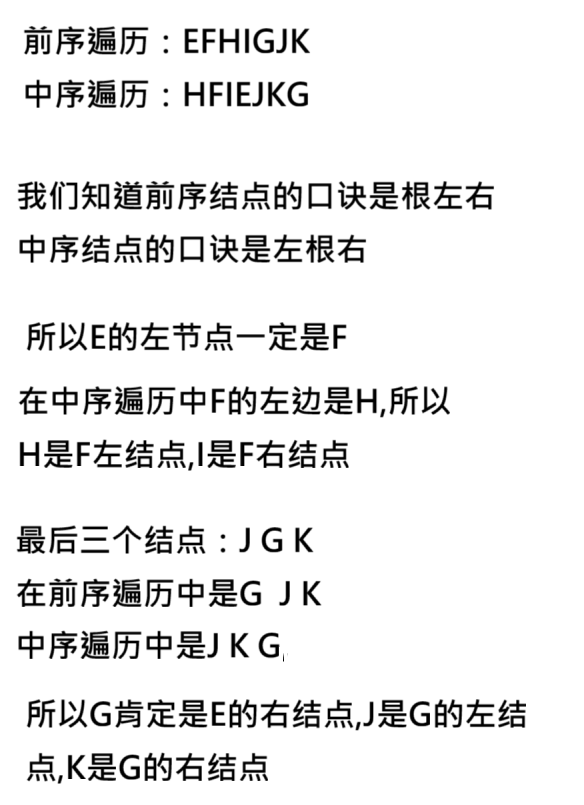 解析: 我们依旧根据遍历规则尝试去画出二叉树的示意图,我们知道后序遍历的尾结点就是二叉树的根节点,故根节点是F,而中序遍历的最后一个结点同样是F,故这棵二叉树没有右结点,我们便可以很快画出二叉树: