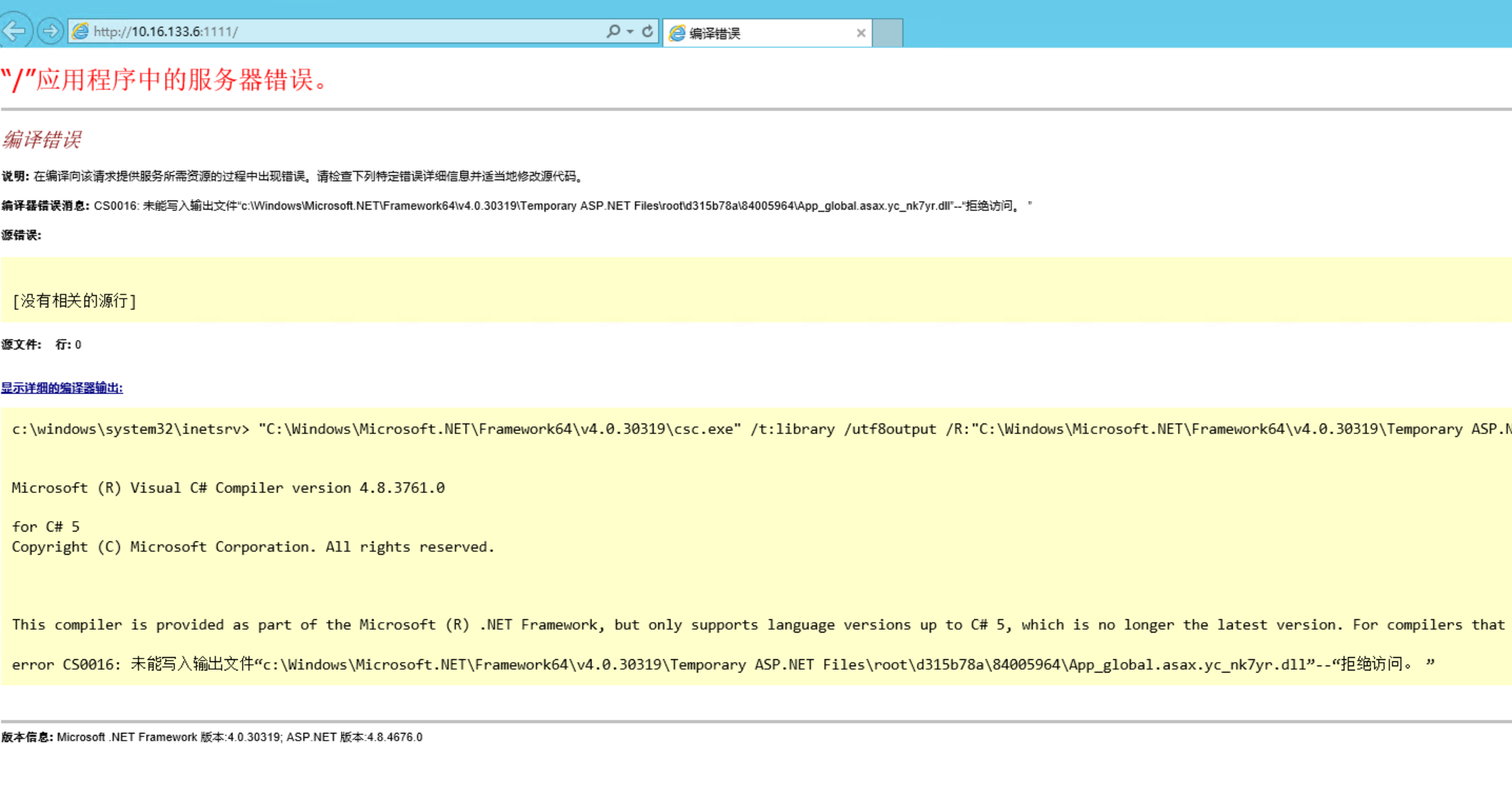 CS0016: 未能写入输出文件“c:\Windows\Microsoft.NET\Framework64\v4.0.30319\Temporary ASP.NET Files\root\
