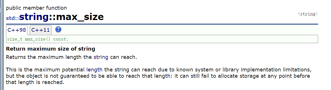 max_size()是 C++std::string类的一个成员函数,它返回的是 该 string 对象在当前系统/实现下理论上能分配的最大字符数(包括'\0'吗?不包括,std::string不计入'\0'的长度)。