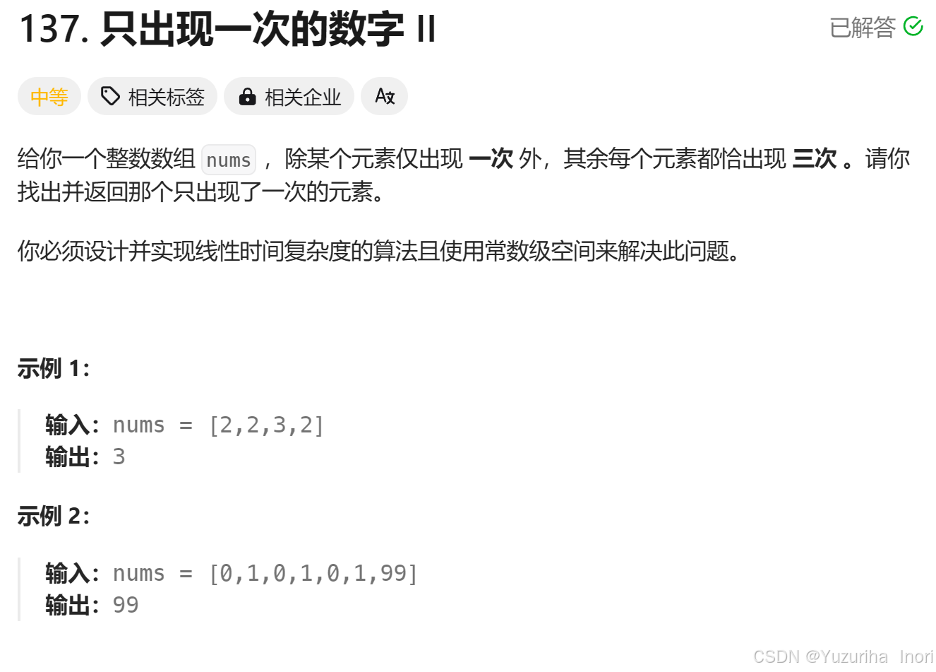 题目链接:137. 只出现一次的数字 II - 力扣(LeetCode)