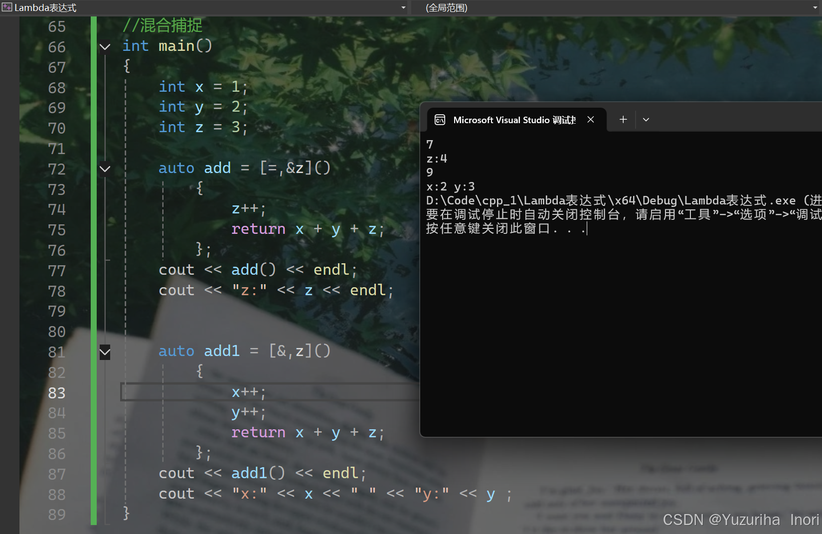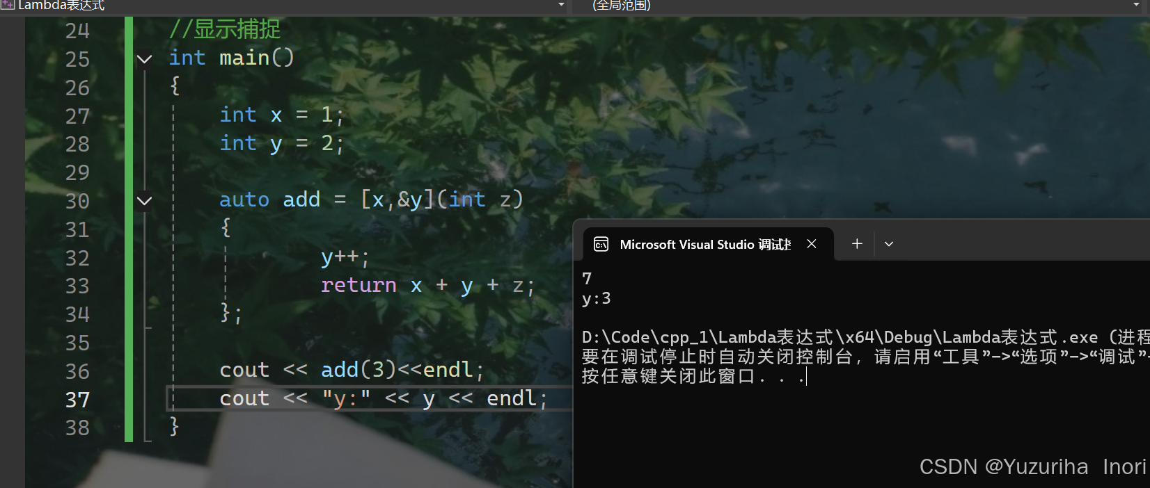 第一种捕捉方式:显示捕捉。显示的写出值捕捉/引用捕捉,捕捉多个变量要用逗号分隔。如图,x是值捕捉,y是引用捕捉,y可以被修改且外部也会被影响。