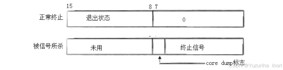 1.status是一个低16位有效的int,通过位划分存储子进程的信息 2.正常终止的情况下:低7位全为0,15~8存放退出码。 获取退出码:WEXITSTATUS(status) 3.非正常退出:退出码无意义,第7位存放标志,6~0存放信号编号 判断一个进程是否位正常退出:WIFEXITED(status),正常为真。