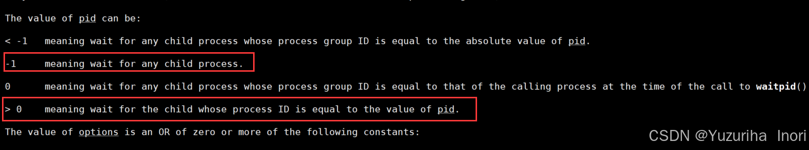 pid_ t waitpid(pid_t pid, int *status, int options);下面详细介绍一下每一个参数: